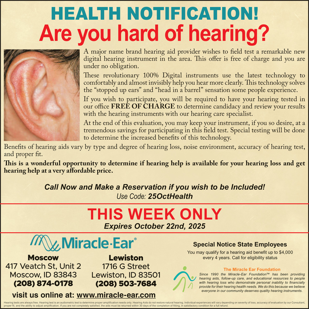 Oct 11, 2025. Miracle-Ear Hearing Aid Center Hearing Ads from Moscow-Pullman Daily News