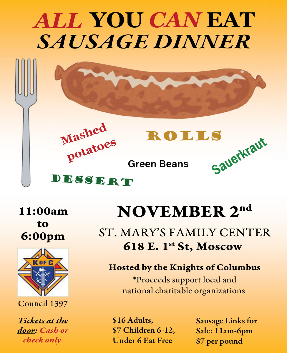 Oct 25, 2025. All You Can Eat Sausage Dinner (November 3nd, 2025) Events Ads from Moscow-Pullman Daily News