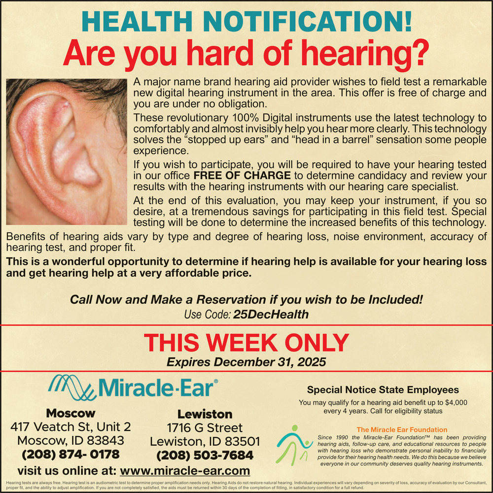 Dec 20, 2025. Miracle-Ear Hearing Aid Center Hearing Ads from Moscow-Pullman Daily News