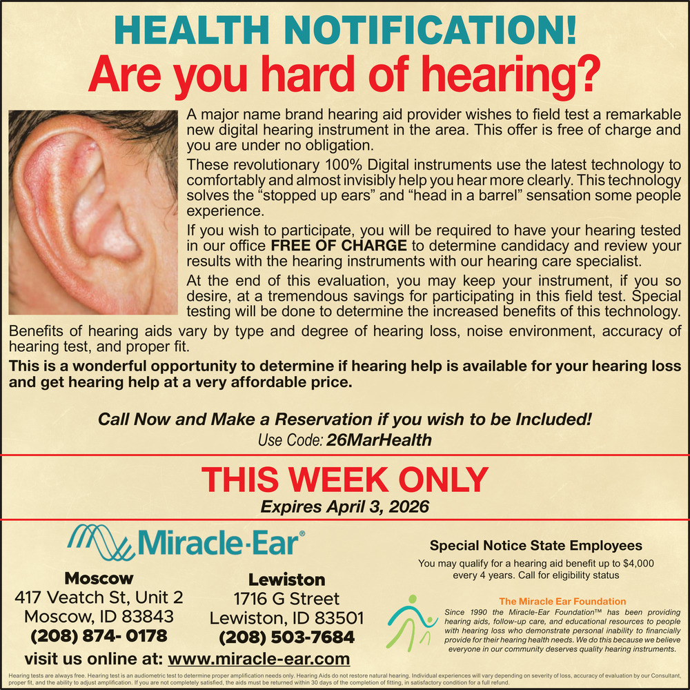 Mar 26, 2026. Miracle-Ear Hearing Aid Center Hearing Ads from Moscow-Pullman Daily News